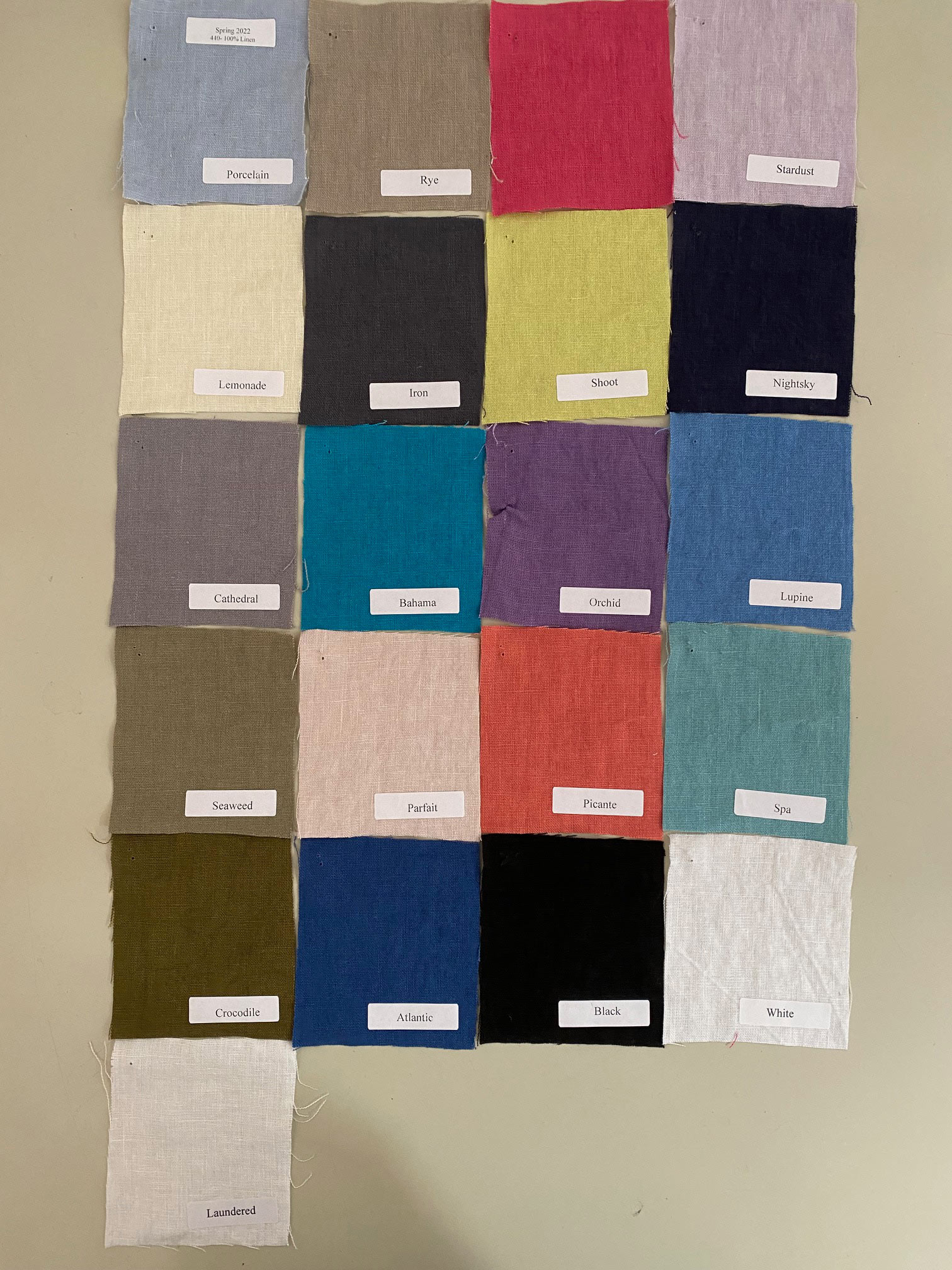 | Colors | Atlantic, Bahama, Berry, Crocodile, Lemonade, Lupine, Nightsky, Orchid, Parfait, Picante, Porcelain, Shoot, Spa, Stardust, Rye, Iron, Seaweed, Cathedral, Black, White, Laundered |